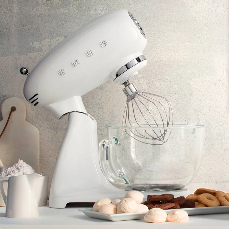 طراحی همزن اسمگ تمام رنگ سفید مدل SMF03 بهطور خاصی الهام گرفته از سبک رترو دهه 50 میلادی است. این طراحی کلاسیک در کنار جزئیات مدرن و کاربردی، آن را به یک قطعه هنری در آشپزخانه تبدیل کرده است. در عین حال، طراحی آن به گونهای است که با دکوراسیونهای مختلف، از مدرن گرفته تا کلاسیک، بهخوبی هماهنگ میشود. طراحی منحصر به فرد و زیبا بهویژه در ترکیب رنگ سفید یکپارچه آن نمایان است.